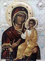 Иверская икона (которая сейчас хранится на Афоне) в IХ веке находилась у одной благочестивой вдовы, жившей близ города Никеи. При императоре Феофиле (829-842) иконоборцы, уничтожавшие святые иконы, пришли в дом этой христианки, и один воин копьем ударил по образу Богородицы. Тотчас из пораженного места потекла кровь. Вдова, боясь уничтожения святыни, пообещала императорским воинам деньги и просила их до утра не трогать икону. Когда они ушли, женщина вместе с сыном (впоследствии афонским иноком), для сохранения святой иконы опустила ее в море. Икона, стоя на воде, приплыла к Афону. Афонские иноки, несколько дней видя в море огненный столп, восходящий до неба, пришли к берегу и нашли святой образ, стоящий на воде. | |